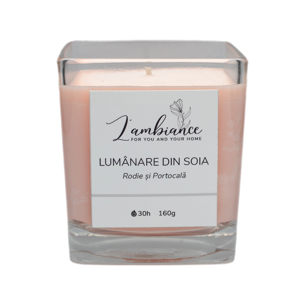 Lumanare parfumata din soia, cu arome de Rodie si Portocala este fabricata din ceara naturala de soia, 3% ulei de parfum si este disponibila intr-un pahar mare reciclat cu un capac special pentru praf. Uleiurile parfumate folosite sunt sigure pentru copii, femeile insarcinate si pentru animalele de companie. Lumanarile sunt vegane si nu sunt testate pe animale.